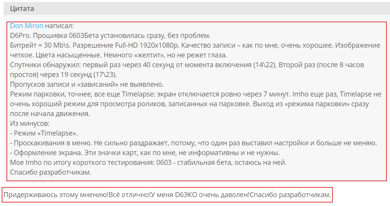 Частично согласен с Вами. Я сказал "спасибо" исключительно от себя. Все что я написал в процитированном Вами посте, я писал исключительно в отношении своего ВР. Читая комментарии с описанием проблем от других пользователей, я понимаю, что мой случай скорее исключение. В принципе, у меня к ДК те же претензии, что и у всех: продали недоделанный товар (не предупредив об этом) за нереальную для него сумму, больше года мусолят прошивку и не довели ее до заявленных характеристик, Timelaps вместо режима парковки и т.д. Знаете как говорят в Украине: "Не мала баба клопоту, купила порося". Вот так и у нас. Вместо того, чтобы купить-поставить и забыть, каждый день мониторим форумы, пытаясь понять причины и дальнейшие действия, чтобы этот агрегат хоть как-то работал. Повторюсь, на сегодняшний день, работа моего D6Pro, с прошивкой 0603, меня устраивает. Если будут улучшения в прошивке - буду доволен еще больше. Если начнет глючить, буду так же как и большинство, писать негативные отзывы и багрепорты. Но какашками кидаться не буду. Не мое это. Мне больше по душе конструктивное общение. Жаль конечно, что с представителями ДК, не всегда это получается. Снова соглашусь, только немного в другой интерпретации: Искренне желаю, что бы мы все, в конце концов, получили отличный регик. P.S. Отдельное СПАСИБО хочу сказать форумчанам ВР-Форума за поддержку, подсказки, консультации. А Хреноредьеву еще и за отличное чувство юмора в перемешку с сарказмом.