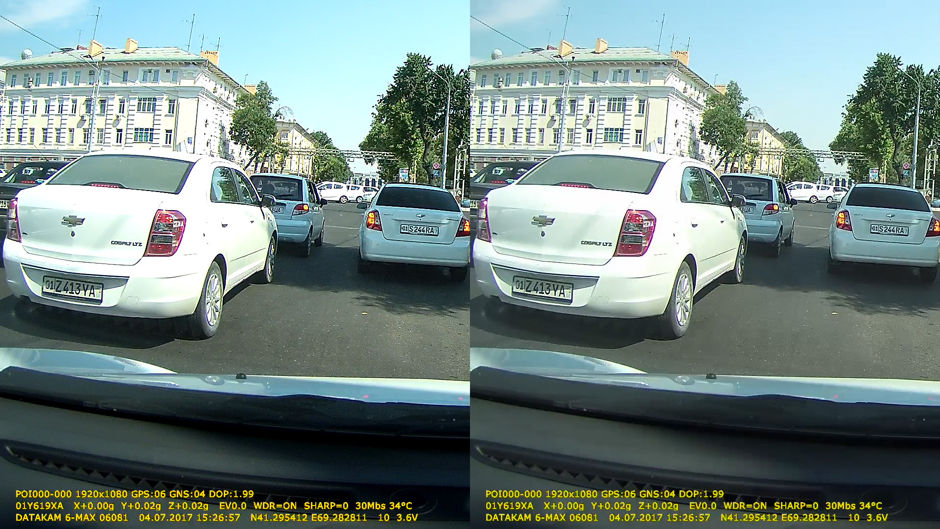 Отвечу кратко. 1. Господа! Я настоятельно обращаю Ваше внимание на то что прежде всего нужно правильно настроить монитор по контрасту и яркости. Не правильно смотреть видео и фото на вывернутых на "максимал" настройках,...разумеется цвета буду искажены. 2. Не нужно принимать мою точку зрения на то каким Вам хочется видеть Ваш регистратор в деле,...хотите верить в непогрешимость цветности вашего регистратора...ради Бога. Я в отличии от Датакам не взял с Вас ни копейки ,...и замечу не продвигаю свою позицию в плане передачи цветов на Ваших личных приборах. Это Ваш выбор и Вы сами решаете верить в эталон от Датакама или по сравнивать с другими изделиями с такими же матрицами. Я вот решил сравнить ... на результат по цветности можете посмотреть сами. То что видео со смартфона "дрожит" не обессудьте,...тяжёлый он для обычного крепежа для навигаторов. Но суть как раз не в чёткости картинки,....суть в цветовой гамме. У обоих устройств матрица SONY EXMOR,...но вот настроены они совершенно по разному. Особенно обратите внимание на то каким цветом асфальт, земля, небо, деревья, синий-белый цвет павильона ....и т.п. Если Вы уважаемые комрады, считаете что белая машина допускает примесь жёлто-зелёного оттенка и асфальт в Ташкенте с зеленцой.....то я просто умолкаю и не буду спорить с Вашими железными аргументами. А это видео моего маленького эксперимента. https://yadi.sk/i/BBsRsa573KpEGk