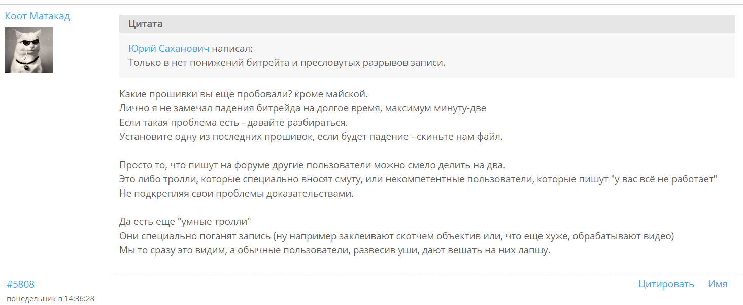 Потому как это должно быть реализовано иначе. Поднимается IR-CUT фильтр и только тогда активируется монохром. При этом сам монохромный режим должен быть настроен, а не быть стоковым. Похожее было на стареньких DOD'ах в ручном режиме. На современных моделях это делается автоматикой холдера как в IP-камерах, при этом активацию в ручном режиме также можно произвести: Увы, такая копеечная "роскошь" недоступна "лучшему в мире", простите, как бы "КБ". Зато в китайском регистраторе с аналогичным железом за 6000р. эта опция есть...) В эту сумму входит и работающий HDMI, AV-выход, ионисторы, широкоугольная оптика с реальным диафрагменным числом F1.6 ит.д....