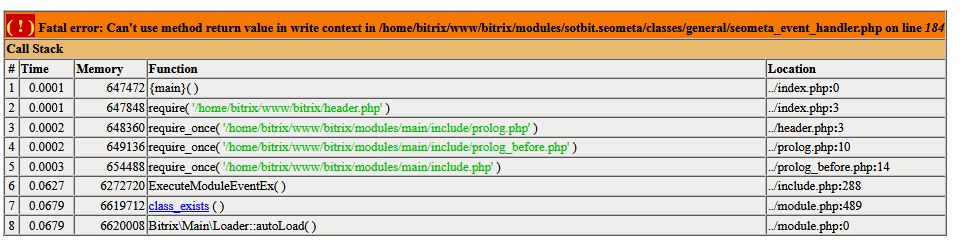 при попытке открыть форум датахлам ( ! ) Фатальная ошибка: не может использовать метод возвращаемое значение в контексте записи в /home/bitrix/www/bitrix/modules/sotbit.seometa/classes/general/seometa_event_handler.php на линии 184 Стек Вызовов # Время Памяти Функция Расположение Кто что подскажет?
