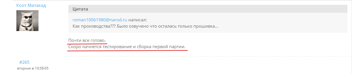 roman10061980@narod.ru написал: Как производства??? Было озвучено что осталась только прошивка... ДК:Почти все готово. Скоро начнется тестирование и сборка первой партии. Они еще и не собирали их а бабло уже собирают по предоплате.