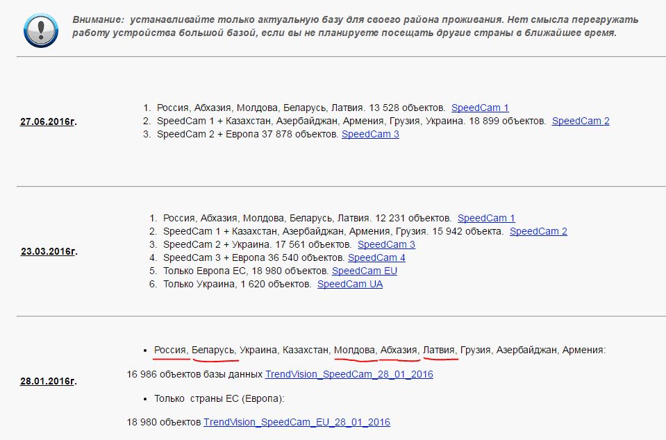 Нет смысла перегружать работу большой базой, если Вы не планируете посещать друге страны. Согласен. Тогда почему давая рекомендации "не перегружать устройство большой базой", производитель не делает базы спидкамов для каждой страны отдельно (для своего района проживания). Пусть пользователь выбирает сам какую базу устанавливать. Например, согласно предыдущего сообщения: в марте база спидкамов была отдельным файлом, в июне - уже нет.