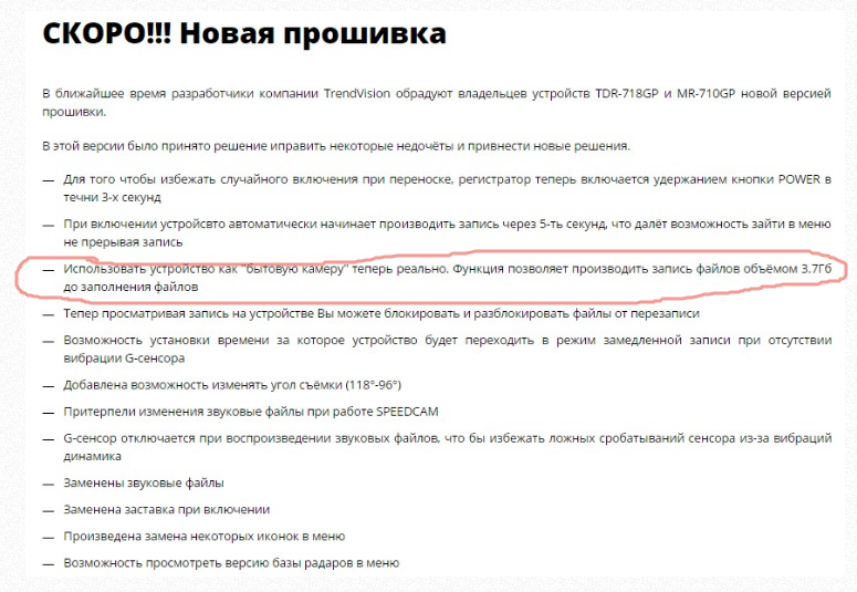 TrendVision TDR-718GP Спойлер: Характеристики Процессор - Ambarella A7LA70 Матрица - OmniVision OV4689, CMOS 1/3', 4Мп Оперативная память - 2GB DDR3 NAND память - 128MB Разрешение видео - 2304х1296p 30 к/с, 2560х1080p 30к/с, 1920x1080p 60к/с, 45к/с, 30 к/с, 1280х720p 60к/с, 30 к/с Разрешение фото - 1920х1080 Оптика - Стеклянный объектив, 6 линз, F=1.8, f=2.8мм, угол обзора - 160° (115° по горизонтали) Монитор - 2.7", высококонтрастный Внутренняя память - нет Выключение монитора - есть, автоматически, настраивается в меню, 10 сек., 30 сек., 1 мин Циклическая запись - есть, потоковая запись без пропусков между файлами, настраивается в меню, 1 мин. - 15 мин Две камеры - Нет Дополнительно в комплекте нет Температурный диапазон - от -20°С до +50°С Габариты - 95х40х54 (мм) Вес - Около 85 гр. ( без кронштейнов) Часовая батарея Суперконденсатор - 0,22Ф для сохранения даты и времени Аккумуляторная батарея - Встроенная, 300мА/ч, около 15 минут автономной работы при выключенном мониторе Режим воспроизведения - есть, стоп-кадр, ускоренная перемотка вперед/назад, замедленная перемотка вперед/назад Сжатие - Н.264 (Mpeg-4, part.10) Наложение даты и времени - есть, настраивается в меню Автоматическое включение - есть, при подаче внешнего питания, настраиваемая задержка в меню Питание - 12-24В. Зарядное устройство для автомобильного прикуривателя в комплекте Язык меню - русский, английский Карта памяти - microSD до 128GB, SD до 32GB Bit rate - 10-36 мб/с, настраивается в меню G-сенсор - есть, возможность отключать через меню GPS - есть, выносной блок CPL-фильтр - есть, быстросъемный на магните 37мм Датчик движения - есть, управление через меню Микрофон - есть, возможность отключать кнопкой или через меню Динамик - есть, регулировка громкости через меню, возможность отключать кнопкой HDMI-порт - есть, для подключения к цифровому монитору или TV, разрешение 1920х1080i AV-порт - нет USB-порт - есть, miсroUSB 2.0 Автоматическое выключение - есть, при снятии внешнего питания, настраиваемая задержка в меню Госномер - есть, настраивается в меню, 11 знаков, анг. язык и цифры Защита файлов от перезаписи - есть, кнопкой или с помощью G-сенсора Время записи на карту - 32 ГБ около 3-х часов, на карту 128ГБ около 12 часов, в максимальном разрешении Спойлер: FAQ FAQ на Google.Docs от участников форума (настройки, прошивки Оф. и МОД, SpeedCam, ссылки) Если регулярно "слетает" прошивка, регистратор отключается во время работы, горит только синий светодиод - см. по ссылкам ТП - от @ag-70 (пост.#16946 стр.848) Про повышенный битрейт (bit rate) и карты памяти: Рекомендуется использование скоростных карт памяти из-за повышенного битрейта в ПО. Чем выше битрейт - тем больше и по объему занимает места ролик на карте. Если вы не видите разницы 36мбит/сек - против 20мбит/сек, то нет смысла ставить максимальный битрейт. Как лучше всего настроить регистратор? Оптимальными настройками для всех разрешений на официальном ПО будут значения по умолчанию или (стоковые). Также можно сказать, что у всех разные предпочтения, настройки приведенные ниже для MOD’ов Trend Vision TDR-718 (MDR-710) подбирались пользователями опытным путем и считаются максимально оптимальными для дня и ночи Сравнение качества сьемки и детализации WideFHD и FullHD на разрешениях 2560x1080 и 1920x1080 (днем) пост #4874 стр.244 от @Kaliningrad ночью FullHD уже обходит WFHD по детализации Какая карта памяти необходима? В виду применения повышенного битрейта в современных видеорегистраторах, рекомендуется брать карты с запасом по скоростным характеристикам с индексом U и о