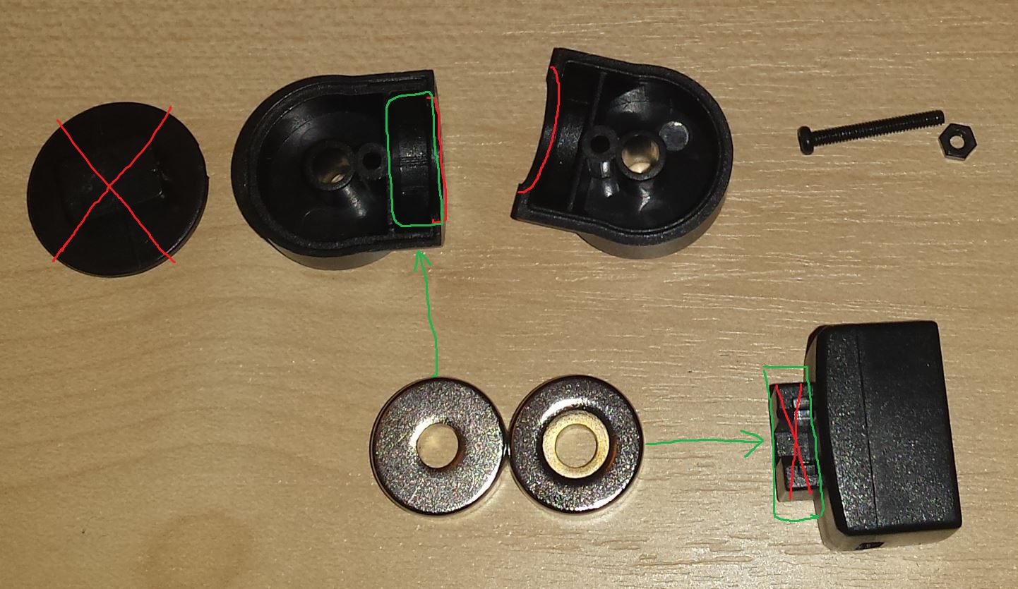 Красным пометил места переделок (отлома и подточки), зеленым места установки магнитов.